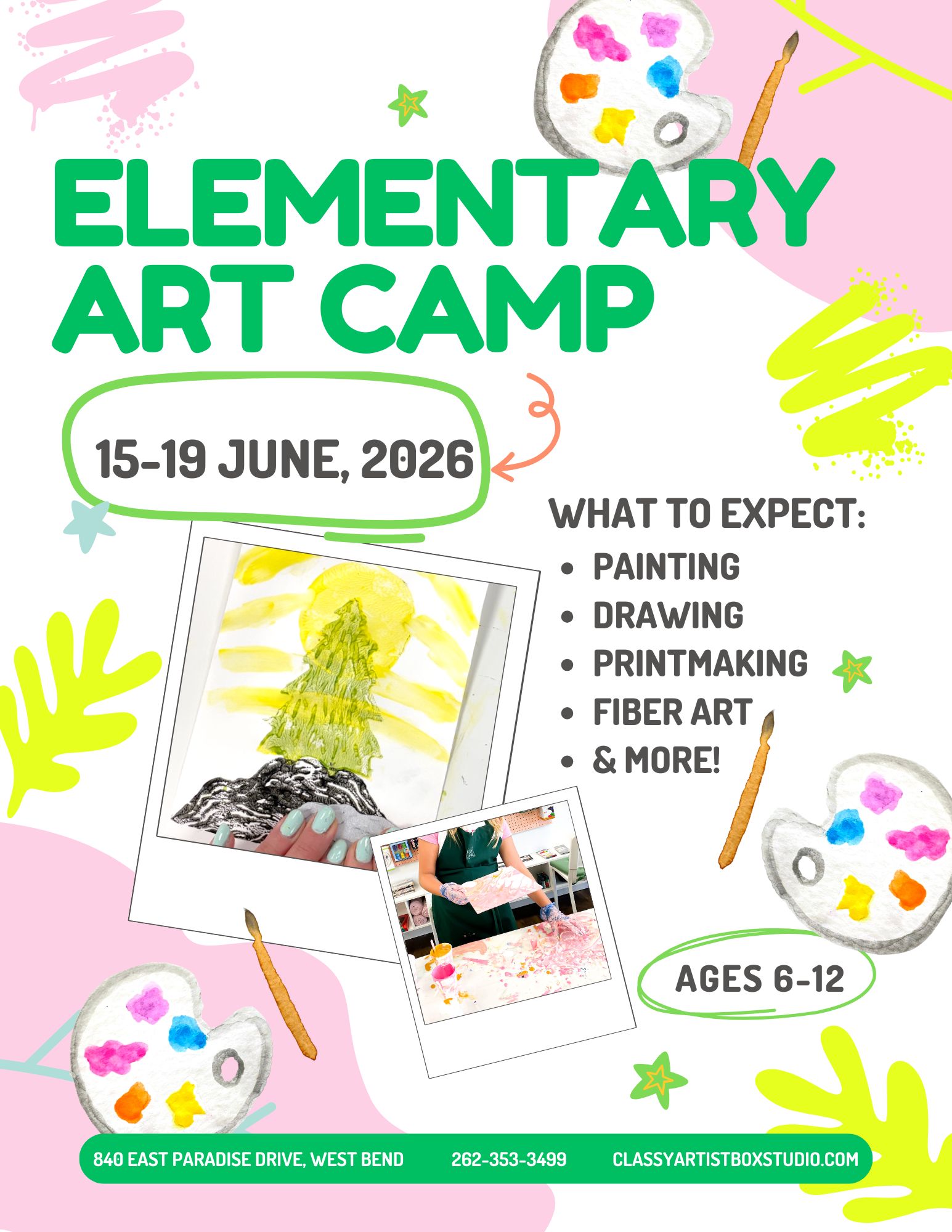 Welcome to the Classy Artist Box Art Camp information listing! We are only planning so far on hosting one art camp this summer from June 15 – 19, 2026 since we may move locations in July.